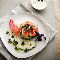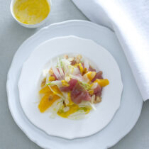 Puoi cominciare con la ricetta del Tonno con arance, finocchi e mandorle e proseguire con la raffinata ricetta degli spaghetti con frutti di mare e crostacei cotti e crudi. Come secondo piatto prova la gustosa ricetta del tournedos al burro verde e rosa. E il dessert? Ci sono i tortini al cioccolato con salsa mou, caldi, morbidi e dolcissimi, proprio come l'amore. Buon appetito.