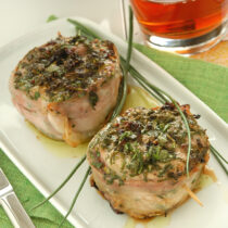 Un filetto di maiale farcito con bietole, parmigiano e prosciutto crudo cotto al forno con sfiziose verdure, vino rosso e brodo.