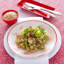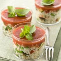 Ispirazione mediorientale per l’originale tabulè con riso bianco e rosso (foto in alto): le due varietà di chicchi si cuociono separatamente e si condiscono con pomodorini, cetrioli, cipollotti, menta e finocchietto.