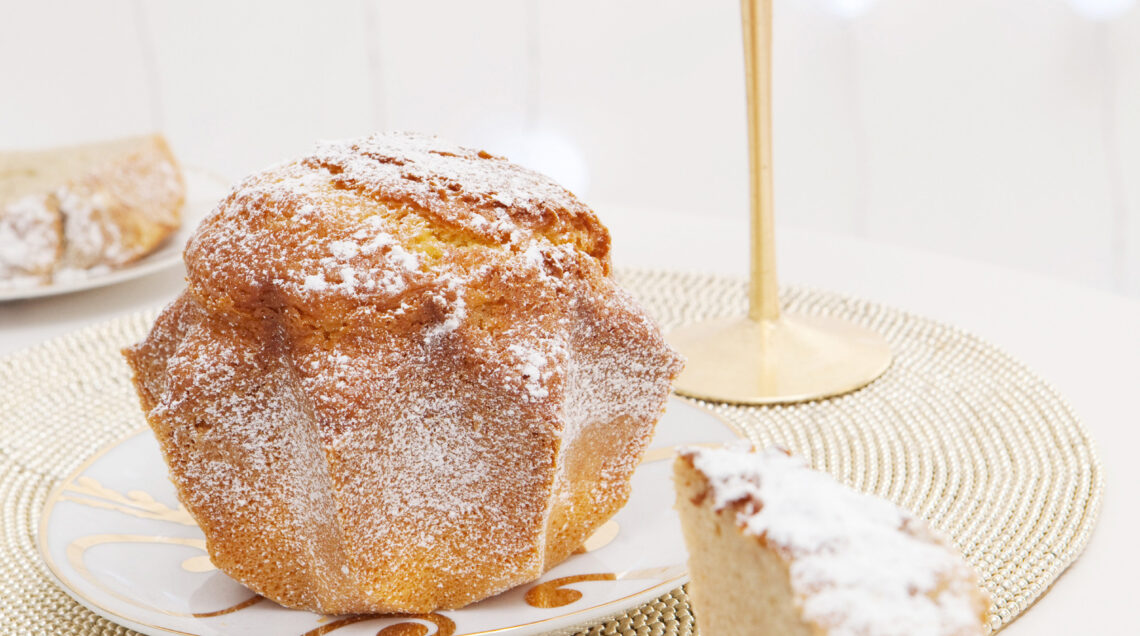 3) Imburrate e infarinate 2 stampi da pandoro da mezzo litro. Versate gli impasti e infornate a 180° per 45 minuti. Sfornate i finti pandori e lasciateli raffreddare prima di sformarli su due piatti di portata. Cospargeteli di zucchero a velo e serviteli, se vi piace, con chicchi di melagrana.