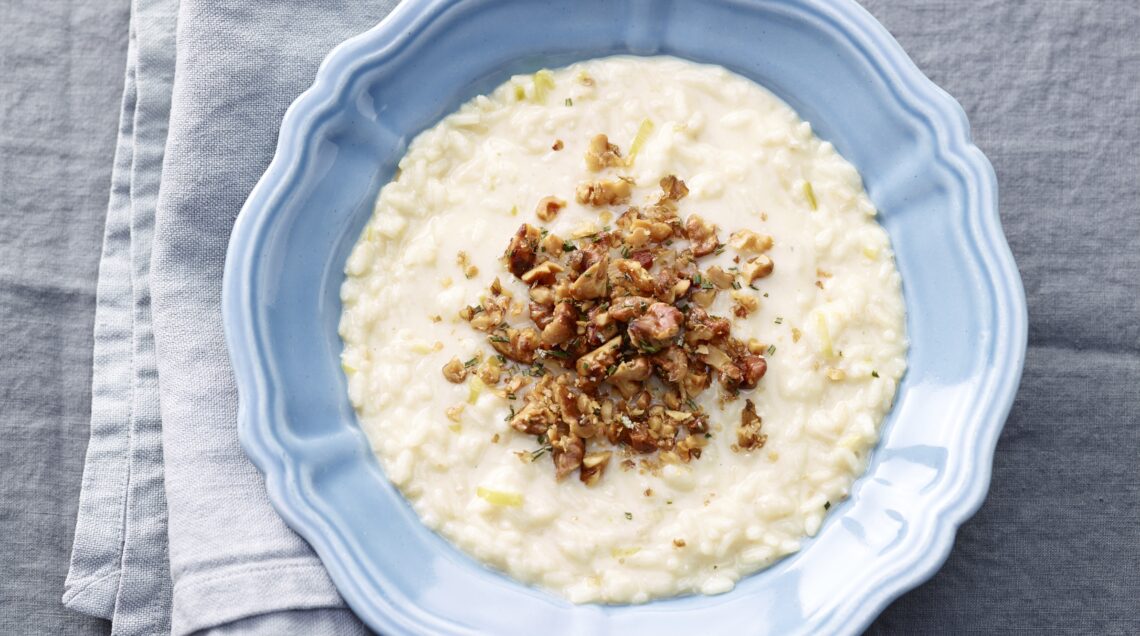 3) Quando il riso è al dente, fuori dal fuoco unite mascarpone e parmigiano regolate di sale e lasciate riposare coperto per 2 minuti. Servite il risotto con le noci e una macinata di pepe.
