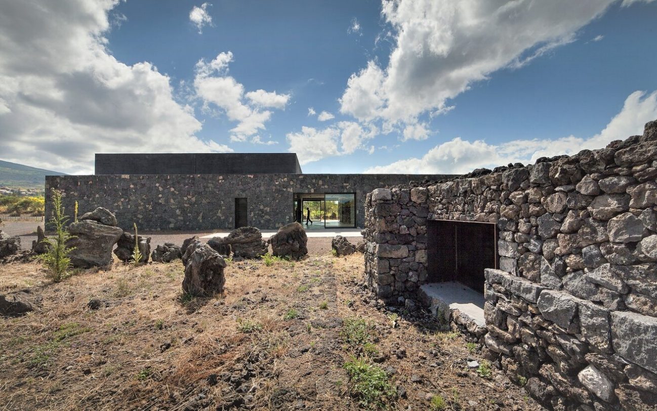 Affascinante e suggestiva, la cantina Feudo di Mezzo nasce in un sito eccezionale, un vero e proprio giardino di pietra all’interno di una colata lavica datata 1566: siamo in Sicilia, sull’Etna. La cantina è situata in posizione centrica, tra i vigneti Sciaranuova e Montelaguardia, sempre della famiglia Planeta. Progettata dagli architetti siciliani Gaetano Gulino e Santi Albanese, l’intera struttura è minimal ed elegante, un gioco di parallelepipedi nella campagna etnea che vuole sembrare un giardino con pietre a vista che si integrano perfettamente con il paesaggio naturalistico circostante, in un matrimonio tra bioarchitettura e recupero culturale. Qui la roccia nera vulcanica è protagonista anche nella bottaia, cui è stato dato l’aspetto di antica pietraia. Questa è probabilmente la più grande contrada della Doc Etna: in questi terreni particolarmente fertili crescono anche le vigne del Carricante e Nerello Mascalese oltre ai vini Doc Etna. Ai visitatori è proposto un percorso degustazione.