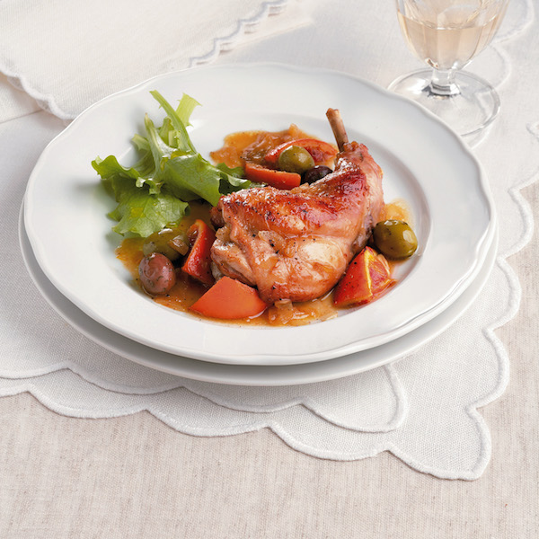 193500Coniglio al Cognac. Mettete 4 cosce di coniglio in una terrina con qualche grano di pepe, 2 chiodi di garofano, 2 foglie di alloro, 50 ml di Cognac e un bicchiere di vino bianco. Coprite con pellicola e fate marinare in frigo per 6 ore, girando i pezzi ogni tanto. Tritate 30 g di lardo, una cipolla e fateli soffriggere in un tegame. Sgocciolate il soffritto e tenetelo da parte. Rosolate nel tegame il coniglio, scolato dalla marinata, con un filo d’olio. Riunite il soffritto, regolate di sale e bagnate con un mestolino di marinata. Fate sfumare e versate il succo di un’arancia. Cuocete coperto per 40 minuti. Aggiungete 80 g di olive verdi e nere, un’arancia lavata e tagliata a spicchi e cuocete per altri 20 minuti. Per 4.