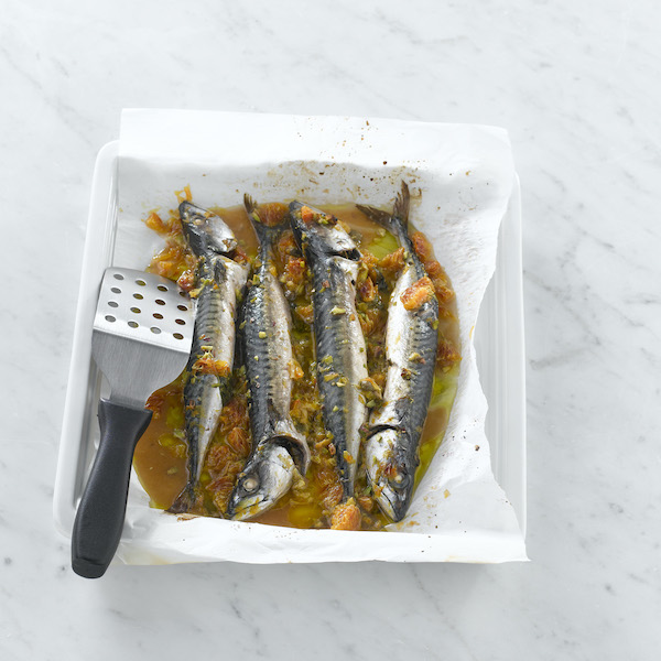 193499Sgombri al pesto di arancia. Sbucciate al vivo 4 piccole arance, ricavate gli spicchi privi delle pellicine, tagliateli a pezzetti e frullateli con una manciata di pistacchi spellati, 50 g di capperi sotto sale dissalati e un ciuffo di basilico. Diluite con olio, regolate di sale e pepate. Pulite e lavate 4 sgombri da porzione (circa 200 g l’uno) e disponeteli in una pirofila, senza sovrapporli. Copriteli con il pesto preparato, pellicola trasparente e fateli marinare in frigorifero per 2 ore. Scolateli dalla marinata, disponeteli in una teglia rivestita di carta da forno e distribuitevi metà del pesto. Irrorate con un filo d’olio, salate leggermente e cuocete nel forno caldo a 180° per 15-20 minuti. Per 4.