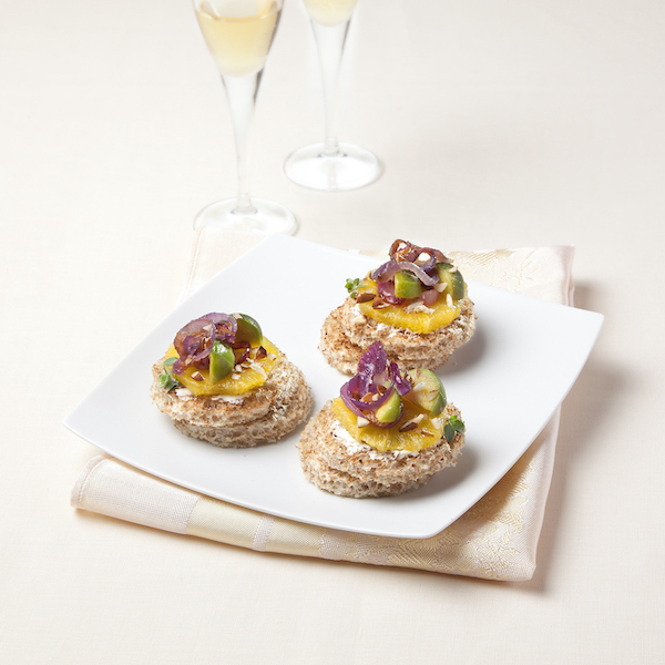 193495Tartine con cipolle rosse e cavolini. Sbucciate 2 piccole cipolle rosse e tagliate ad anelli sottili. Scaldate un filo d’olio in una padella e saltate gli anelli di cipolle. Salate, sfumate con 2 cucchiai di aceto bianco e cuocete finché le cipolle sono tenere. Sbucciate al vivo 2-3 arance e tagliatele in 16 rondelle. Dividete a spicchi 8 cavolini di Bruxelles lessati. Tostate 16 fette di pancarrè integrale e ricavate dischetti di 6 cm di diametro. Spalmateli con un velo di burro e distribuitevi le rondelle di arance, gli spicchietti di cavolini e gli anelli di cipolla. Cospargete le tartine con mandorle tritate. Per 4.