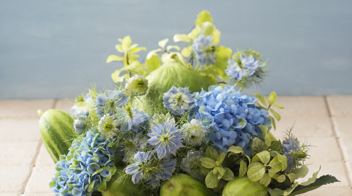 1 piatto fondo smaltato di 25 cm di diametro - 1 spugna per fioristi cilindrica di circa 12 cm di diametro - 1 cetriolo barattiere - 5 o 6 cetrioli carosello piccoli - 3 ortensie blu - qualche rametto di lentisco - 1 mazzetto di fiori di nigella