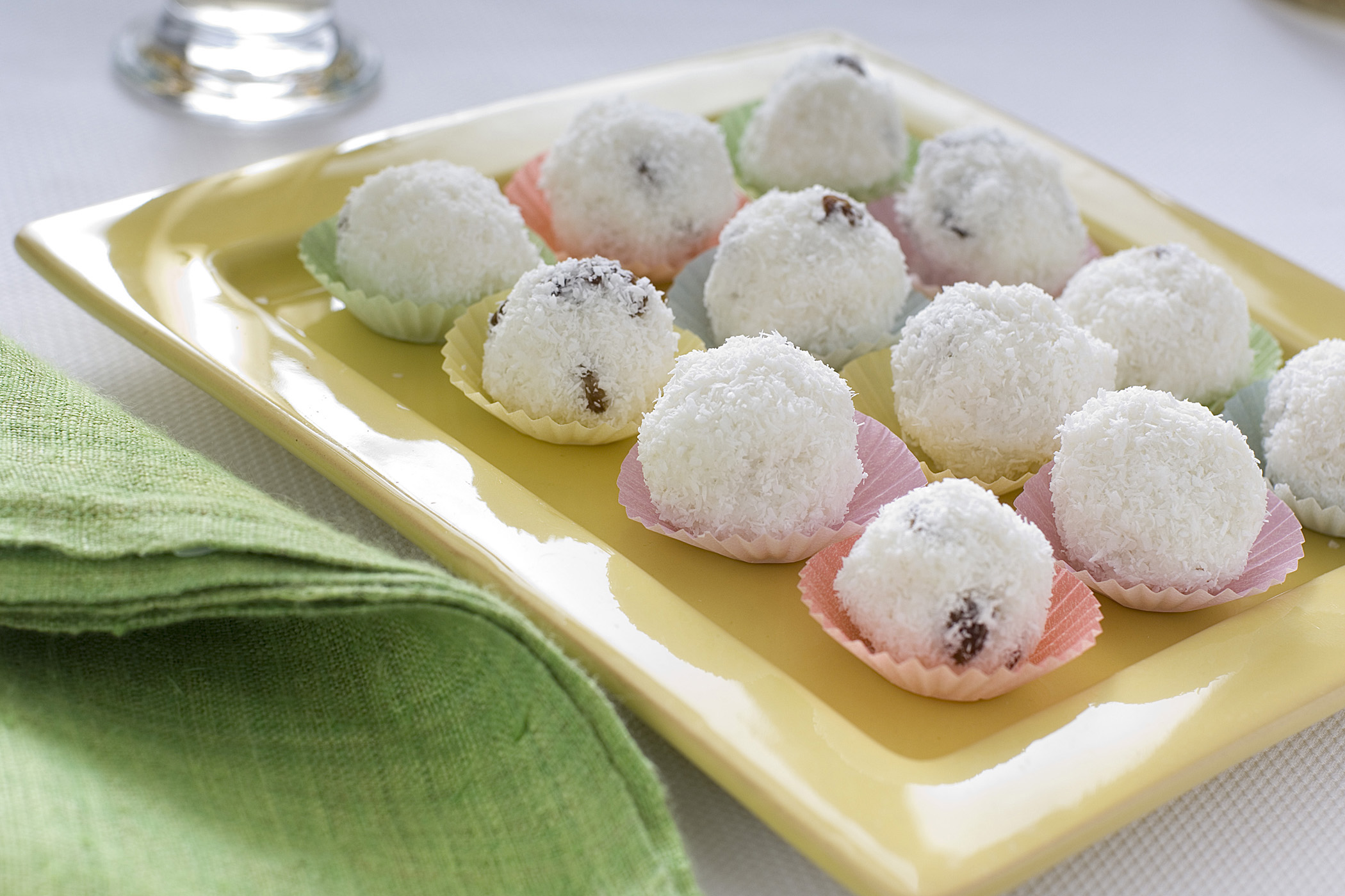 Versate 230 g di farina di cocco in una ciotola, unite 50 g di uvetta ammorbitida in acqua tiepida e ben sgocciolata e 250 g di yogurt e mescolate bene. Quando il composto risulterà omogeneo, formate con le mani tante palline, grosse come noci, rotolate le palline in 30 g di farina di cocco, disponete nei pirottini e servite.