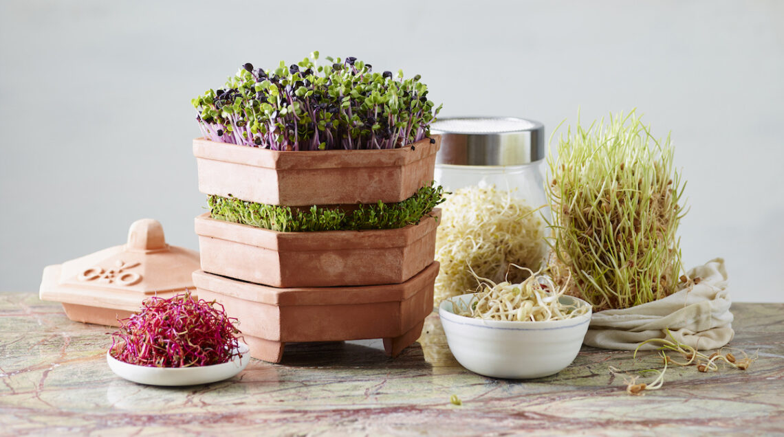 Si usano per far germinare semi di cereali o legumi, ottenendo mini piantine ricche di gusto, nutrienti e belle da vedere. Il modello più classico di germogliatore è a vaschette forate e sovrapposte, in plastica o in terracotta, con un vassoio raccogligocce alla base e un coperchio da usare nella prima fase, quando i semi devono stare al buio. È adatto per germogli che sviluppano steli in verticale, come ravanello, erba medica, cavolo rosso o senape. Il tipo a barattolo, in cui coltivare germogli che formano un groviglio di steli sottili (barbabietola, cipolla, porro) è in vetro, con un tappo a rete utile per scolare l’acqua necessaria, inizialmente, per far partire il processo.