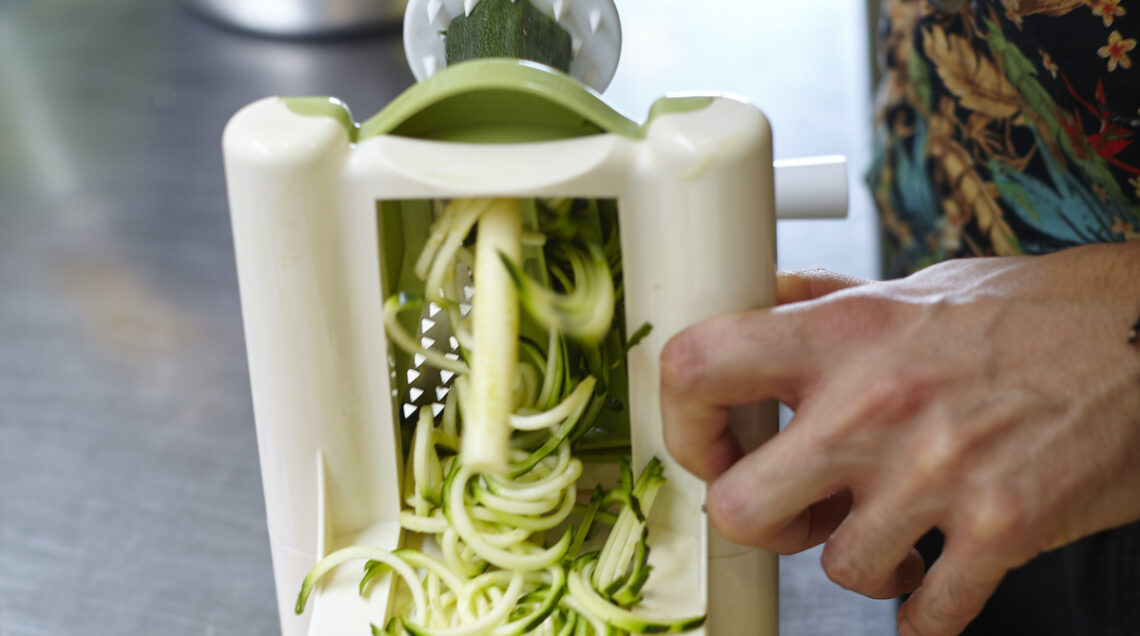 Chiude la nostra carrellata il più divertente fra gli utensili adatti a una cucina veggie e in particolare quella raw: è lo spiralizer, strumento molto semplice che funziona a manovella con lo stesso sistema di una mandolina, cui aggiunge un movimento rotatorio. Grazie a questo meccanismo, è possibile ridurre in lunghe spirali ortaggi e frutti consistenti come zucchine, cetrioli, carote, mele, papaya. I noodles così ottenuto possono diventare spaghetti crudisti o fare da guarnizioni a tantissime preparazioni salate e dolci.