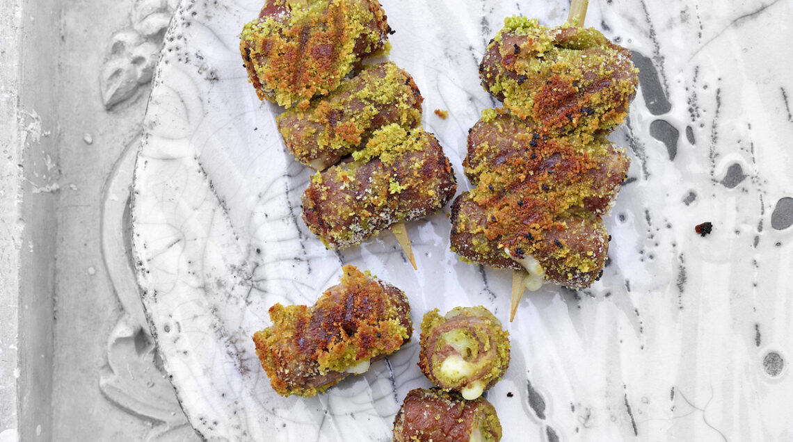 Frullate le foglie di un mazzetto di prezzemolo con 60 g di pangrattato, 40 g di pecorino grattugiato e una presa di sale. Stendete 400 g di fettine di scamone su un foglio di carta da forno, cospargetele con uno strato sottile del mix aromatico, con qualche dadino di pecorino fresco (100 g in tutto) e arrotolate la carne sul ripieno. Infilate gli involtini su spiedini di legno, spennellateli d’olio e passateli nel composto aromatico rimasto. Cuoceteli in friggitrice circa 8 minuti a 180°, voltandoli a metà tempo, finché sono ben dorati.