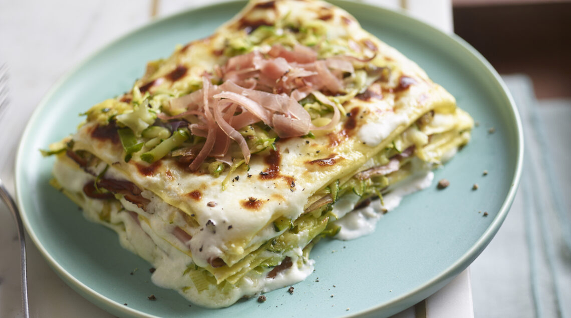 Tritate un cipollotto e fatelo stufare in una padella con un filo d’olio. Unite 300 g di zucchine grattugiate, una presa di sale e cuocete a fuoco vivo finché l’acqua emessa è evaporata. Insaporite pepe e noce moscata. Mescolate 200 g di formaggio fresco di capra con 1,5 dl di panna fresca e un pizzico di sale. Ungete leggermente una pirofila (o 4 pirofiline individuali) e alternate 250 g di sfoglie per lasagne (se occorre, prima sbollentate) con la crema di formaggio, 80 g di speck a striscioline e le zucchine. Terminate con 30 g di grana grattugiato. Trasferite in friggitrice e cuocete a 160° per circa 20 minuti.