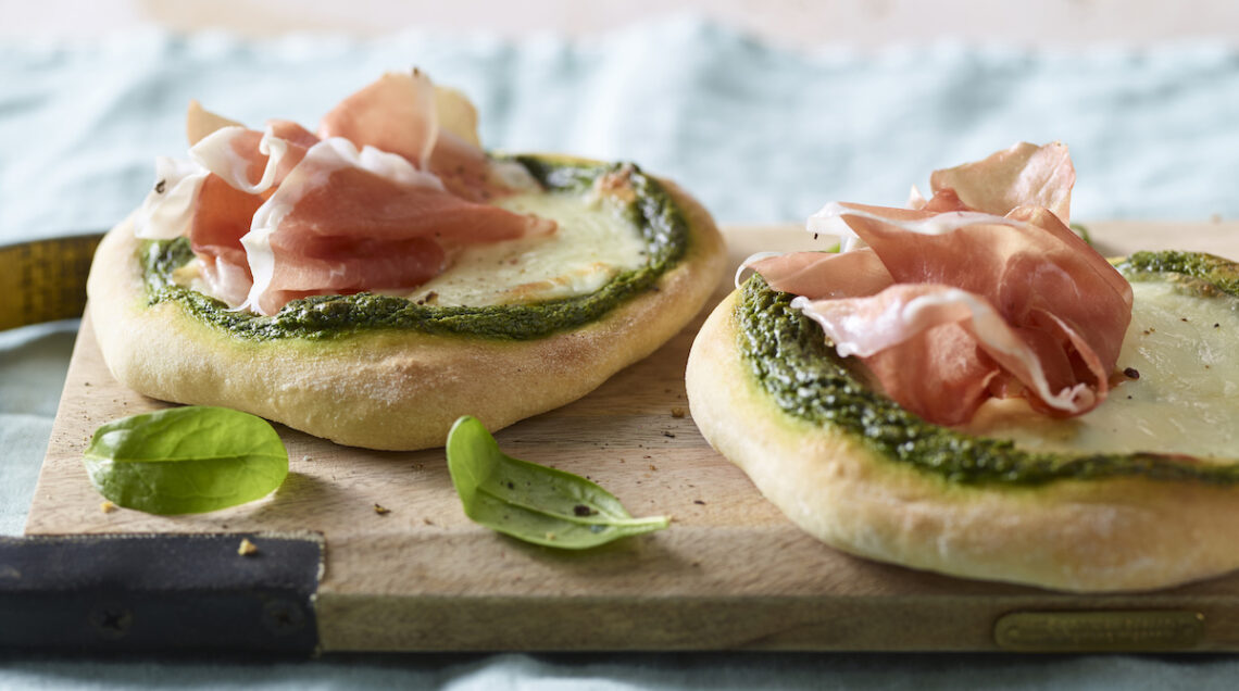 Lavate e asciugate 100 g di spinacini. Frullateli nel mixer con una presa di sale, 50 g di pasta di pistacchio, un filo d’olio, la scorza di un limone grattugiata e uno spicchio d’aglio. Dividete 700 g di pasta da pane in 8 porzioni e stendetele in dischetti sottili. Spalmateli con la crema di pistacchi e spinacini e 150 g in tutto di crescenza a ciuffetti. Disponete le pizzette direttamente nel cestello e cuocetele per 10-15 minuti a 200°: badate che l’apparecchio sia già in temperatura prima di inserire le pizzette.. Completate ogni pizzetta con una fettina di prosciutto crudo e servite.
