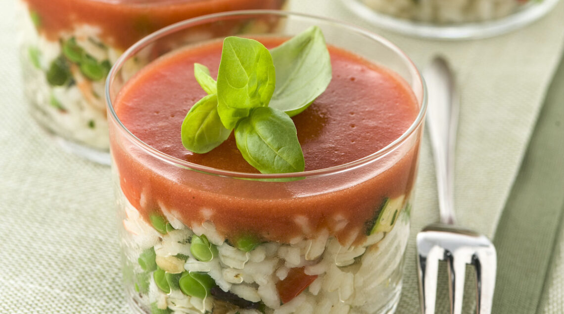 Scottate in abbondante acqua salata 80 g di piselli sgranati, freschi o surgelati. Scolateli e, nella stessa acqua, lessate 280 g di riso parboiled. Scolatelo e raffreddatelo. Scaldate 500 ml di passata di pomodoro con un pizzico di sale e di zucchero, scioglietevi 10 g di gelatina in fogli, ammollata in acqua fredda e strizzata. Mescolate per sciogliere la gelatina e lasciate intiepidire e rapprendere leggermente. Tagliate a pezzetti 3-4 falde di peperoni in agrodolce e una dozzina di olive nere. Mescolateli al riso insieme ai piselli e a 100 g di prosciutto cotto a dadini. Condite con olio, il succo di mezzo limone, pepe e basilico spezzettato. Mescolate bene e distribuite l’insalata di riso in 4 bicchieri. Coprite con la gelatina di pomodoro e mettete in frigo 3-4 ore a rassodare. Guarnite con basilico. Per 4 persone.