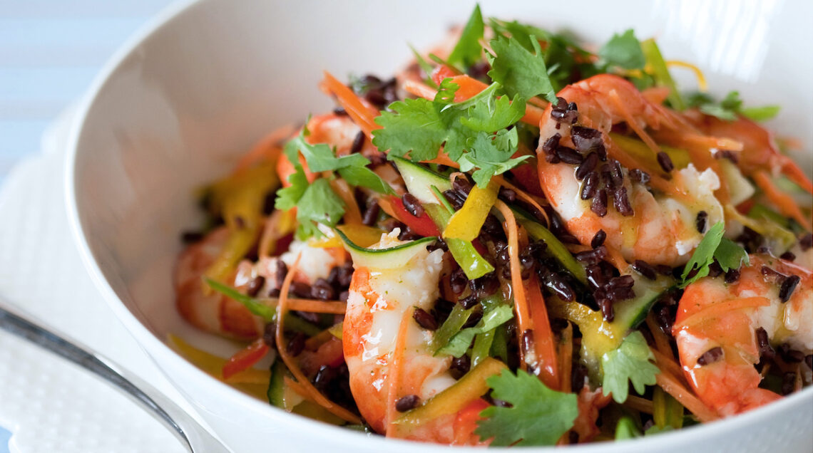 Lessate 180 g di riso Venere in acqua bollente salata per circa 40 minuti. Scolatelo e fatelo raffreddare. Nel frattempo, cuocete a vapore 24 code di gamberi, sgusciatele, salatele e conditele con il succo di mezzo limone. Mondate e tagliate a julienne un piccolo peperone rosso, un piccolo peperone giallo, una zucchina, un cetriolo, una carota e un cipollotto. Mescolateli in una terrina con i gamberi e il riso ormai freddo. Spremete il succo di mezzo limone ed emulsionatelo con 5 cucchiai di olio, la scorza grattugiata, sale e pepe. Versate sull’insalata, mescolate e completate con prezzemolo tritato. Per 4 persone.