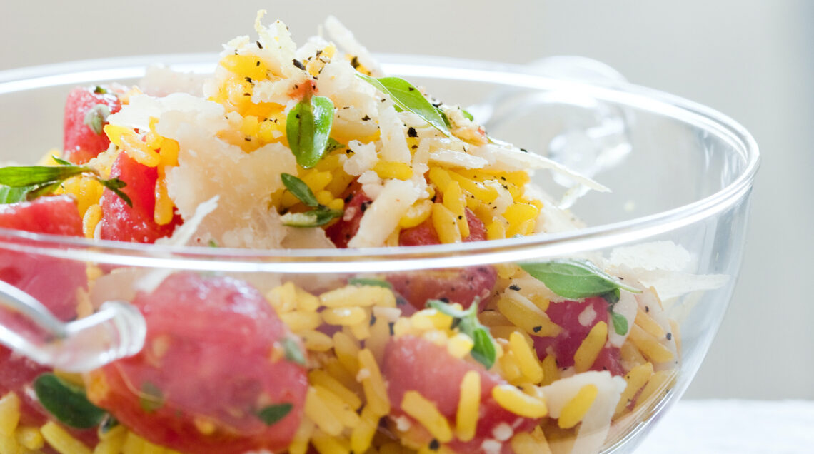 Lessate 200 g di riso Patna parboiled in acqua bollente salata con una foglia di alloro, uno spicchio d’aglio e una bustina di zafferano. Scolatelo al dente e raffreddatelo. Scottate e sbucciate 300 g di mini San Marzano, poi tagliateli a pezzettoni. Conditeli con sale, pepe, la scorza grattugiata di 2 limoni, 60 g di grana padano a scaglie e le foglioline di qualche rametto di timo e basilico. Aggiungete 2 cucchiai di succo di limone e mescolate. Unite il riso al condimento preparato e mescolate ancora. Completate con una macinata di pepe, un filo d’olio e servite. Per 4 persone.