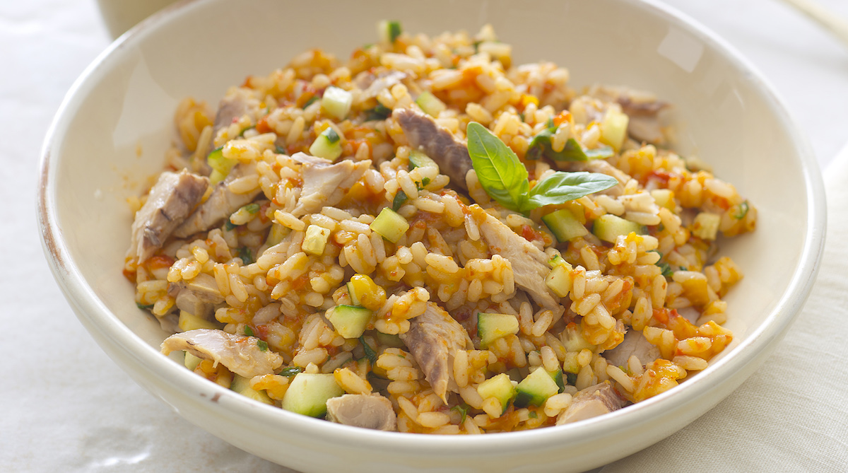 Lavate un peperone rosso, spennellatelo d’olio, mettetelo in una teglia e infornatelo sotto il grill, girandolo più volte, finché la pelle è gonfia e annerita. Sfornate, coprite con alluminio e fate raffreddare. Intanto, sciacquate in un colino 280 g di riso Arborio, lessatelo in acqua salata, scolatelo e fatelo raffreddare. Spellate e pulite il peperone e frullatelo con 4-5 cucchiai di olio, un filo d’acqua, qualche fogli di basilico, sale, paprica e il succo di mezzo limone. Mondate 2 cetrioli e riduceteli a dadini. Uniteli al riso insieme a 125 g di filetti di sgombro sott’olio spezzettati e mescolate. Aggiungete la crema di peperoni, rigirate delicatamente, guarnite con basilico e servite. Per 4 persone.