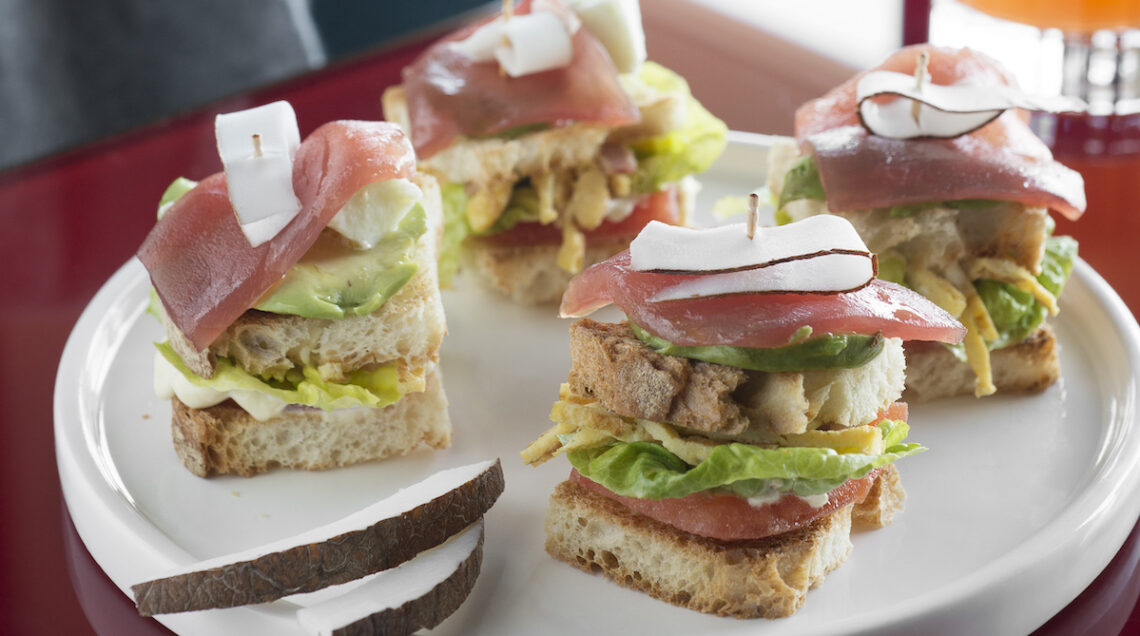 Club sandwich di tonno, cocco e avocado. Rompete un cocco, recuperate l’acqua e fatevi marinare 200 g di carpaccio di tonno (trattato per il consumo a crudo). Tagliate dalla polpa del cocco 8 lamelle sottili. Sgocciolate il tonno e conditelo una grattugiata di zenzero fresco, sale, pepe e un filo d’olio. Sbattete 2 uova con erba cipollina tritata e sale e cuocete una frittata sottile. Scottate e spellate 2 pomodori perini, privateli dei semi, divideteli a falde e conditeli con olio e peperoncino. Sbucciate e affettate un avocado e spruzzatelo di succo di limone. Rosolate 2 fette di pancetta in una padella antiaderente finché sono croccanti e spezzettatele. Dividete a metà 4 mozzarelline. Da 4 fette di pane casereccio, ricavate 16 quadrati regolari. Spennellateli d’olio, salateli leggermente, tostateli in forno e spalmateli di maionese. Componete 8 sandwich sovrapponendo pane, pomodori, foglie di lattuga, pancetta, frittata, ancora pane, avocado, mozzarella, tonno, cocco. Fermate i sandwich con stecchini e accompagnate con il cocco rimasto, tagliato a fettine. Per 4 persone.
