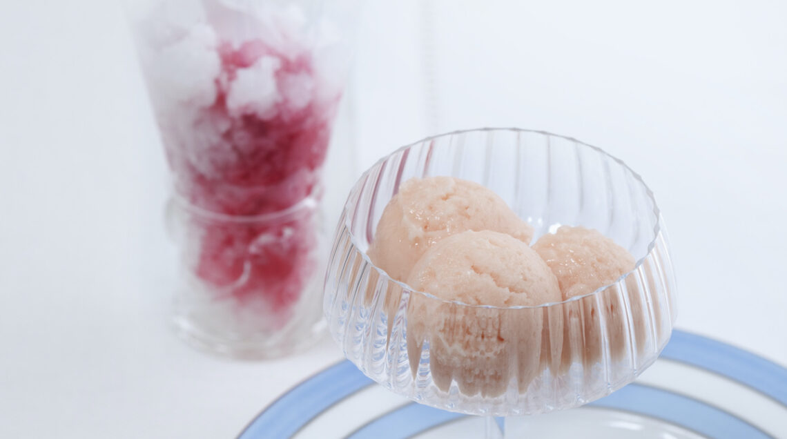 Sorbetto rosé alla pesca e granita di Champagne. Per il sorbetto, cuocete in una casseruola 800 g di pesche intere con 150 g di zucchero e circa 3,5 dl di Champagne rosé, per circa 15 minuti. Togliete dal fuoco e filtrate lo sciroppo. Sbucciate le pesche e frullate la polpa con il liquido di cottura. Unite un dl di Champagne, 2 cucchiai di melassa o miele liquido e uno di succo di limone. Trasferite nella gelatiera e azionate per ottenere il sorbetto. Per la granita, date bollire 3,5 dl di acqua con 100 g di zucchero e un cucchiaio di succo di limone. Fate raffreddare e passate in freezer 30 minuti. Spezzettate con una forchetta, unite 5 dl di Champagne, mescolate e rimettete in freezer per 3-4 ore, rimescolando ogni 30 minuti. Fate bollire 150 g di mirtilli rossi o lamponi frullati con 100 g di zucchero e 1-2 cucchiai d’acqua. Fate raffreddare. Servite la granita con la salsa. Per 8 persone.
