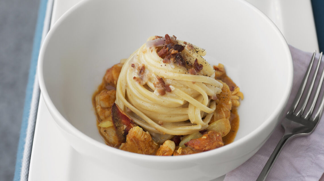 Linguine all’amatriciana con l’astice. Rosolate 80 g di pancetta in una padella finché risulta croccante, scolatela su carta da cucina e sminuzzatela. Soffriggete in un tegame una cipolla rossa tritata con un filo d’olio, un pomodoro a dadini e peperoncino a piacere. Sfumate con poca acqua. Unite la pancetta e cuocete 20 minuti. Frullate e completate con un trito di maggiorana, 40 g di pecorino grattugiato e un filo di olio crudo. Scottate 5 minuti a vapore un piccolo astice. Sgusciatelo e tagliate la polpa a tocchetti. Dorate in una padella uno spicchio d’aglio con filo d’olio e toglietelo. Unite un cuore di sedano a listarelle, l’astice, una presa di paprica, un pizzico di curry e sale. Sfumate con un bicchiere di vino bianco e fate evaporare l’alcol. Lessate 300 g di linguine, conditele con la crema di amatriciana e servitele a nido sul brodetto di astice. Per 4 persone.