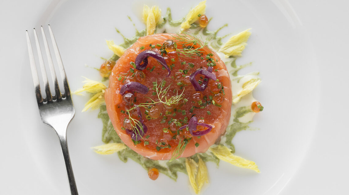Tartare di salmone. Pelate le costole di 100 g di sedano, tagliatele a tocchetti e cuocetele coperte a filo d’acqua. Salate e frullate emulsionando con 2 cucchiai di olio, sale e pepe. Mescolate in una ciotolina un cucchiaio di salsa di soia, un cucchiaino di miele, il succo di un limone e una macinata di pepe. Tagliate a cubetti 400 g di polpa di salmone (trattato per il consumo a crudo) e marinateli nella salsa per qualche minuto. Foderate 4 anelli di metallo con 4 fettine di salmone affumicato e riempiteli con la tartare. Distribuite sui piatti la salsa di sedano e qualche goccia di yogurt, posate sopra le tartare, guarnite con uova di salmone, foglie di sedano, finocchietto ed erba cipollina. Per 4 persone.