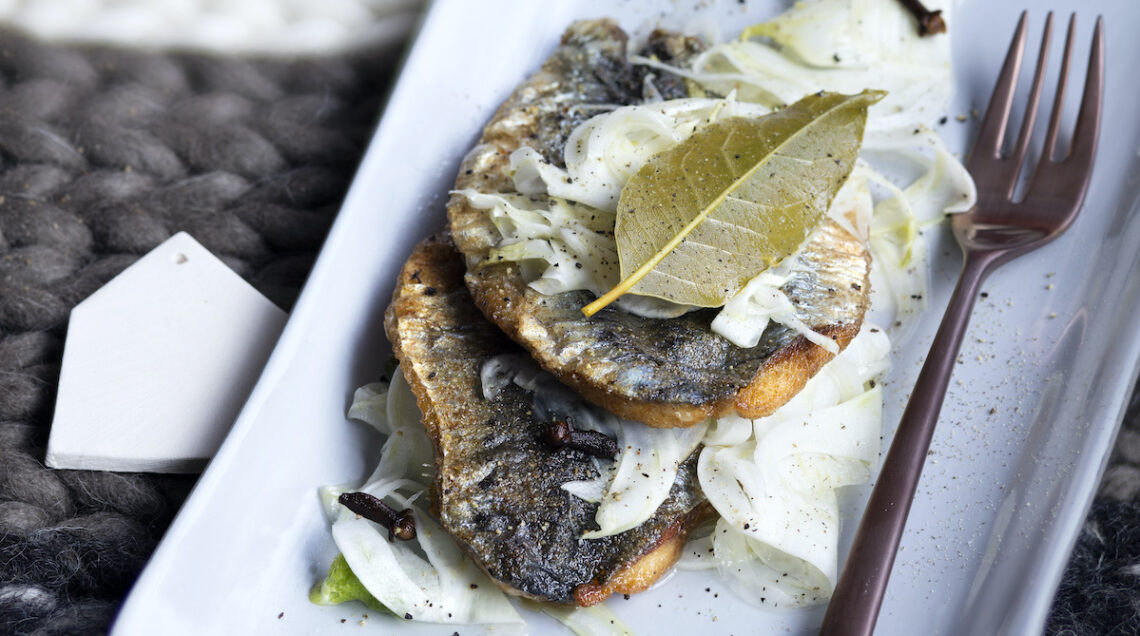 Aringhe fritte all’aceto e finocchi. Portate a bollore in una casseruola 4 dl di aceto bianco con 75 g di zucchero, 5 chiodi di garofano e 2 foglie di alloro. Dopo 5 minuti, spegnete e lasciate riposare. Mescolate 50 g di farina di segale con sale e pepe. Passatevi 20 aringhe fresche pulite, spinate e aperte a libro. Friggetele in 3-4 cucchiai di burro chiarificato e scolatele molto bene su carta da cucina. Affettate 2 cuori di finocchi con una mandolina. Disponete le aringhe in una teglia in 2 strati, coprendole con i finocchi a velo e bagnandole con il carpione. Lasciate marinare per un’ora prima di servire. Per 4 persone.