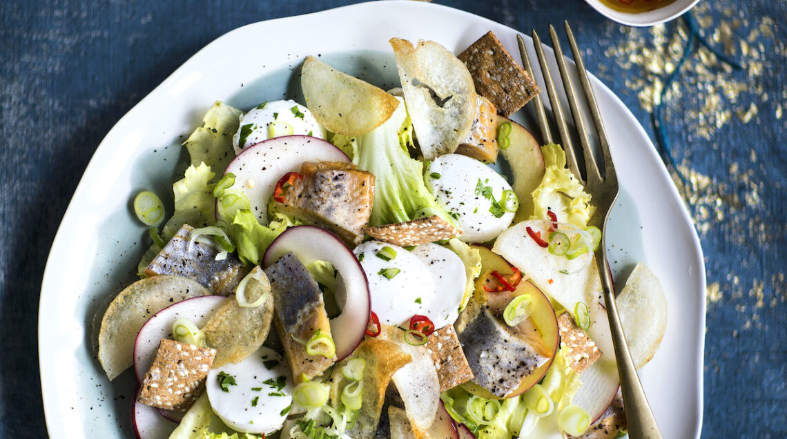 Insalata di aringhe Nord Sud. Preparate 100 g di polenta bianca istantanea, versatela in un bicchiere lungo e stretto e lasciate raffreddare. Sformate il cilindro di polenta, tagliatelo a metà nel senso della lunghezza, quindi a fettine sottili. Allineatele su una placca rivestita di carta forno e cuocetele a 200° nel forno ventilato finché diventano croccanti. Mondate un piccolo cespo di scarola e spezzettate le foglie con le mani. Mescolatele in una ciotola con un cipollotto affettato e 200 g di bocconcini di mozzarella di bufala, tagliati a metà. Private del torsolo 2 mele Annurche e affettatele sottili. Tagliate a pezzetti 4 filetti di aringhe affumicate, già ammollati e dissalati. Riunite gli ingredienti preparati in una terrina di servizio. Emulsionate in una ciotolina il succo di un limone con 2 cucchiai di succo di mela, 4-5 cucchiai d’olio, sale e pepe. Irrorate sull’insalata e servite. Per 4 persone.