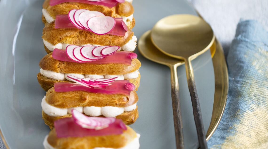 Gli antipasti a base di bignè ed éclair sono un'ottima scelta per Natale: leggeri, eleganti e facilmente personalizzabili. Ogni ripieno racconta una storia di sapori che si armonizzano perfettamente con la delicatezza della pasta choux. L’éclair si trasforma in un antipasto sorprendente, grazie alla crema all'aringa affumicata, soffice e spumosa, che trova equilibrio nella dolcezza della pasta choux. Per un tocco in più, serviteli su un letto di insalatina fresca con vinaigrette leggera.