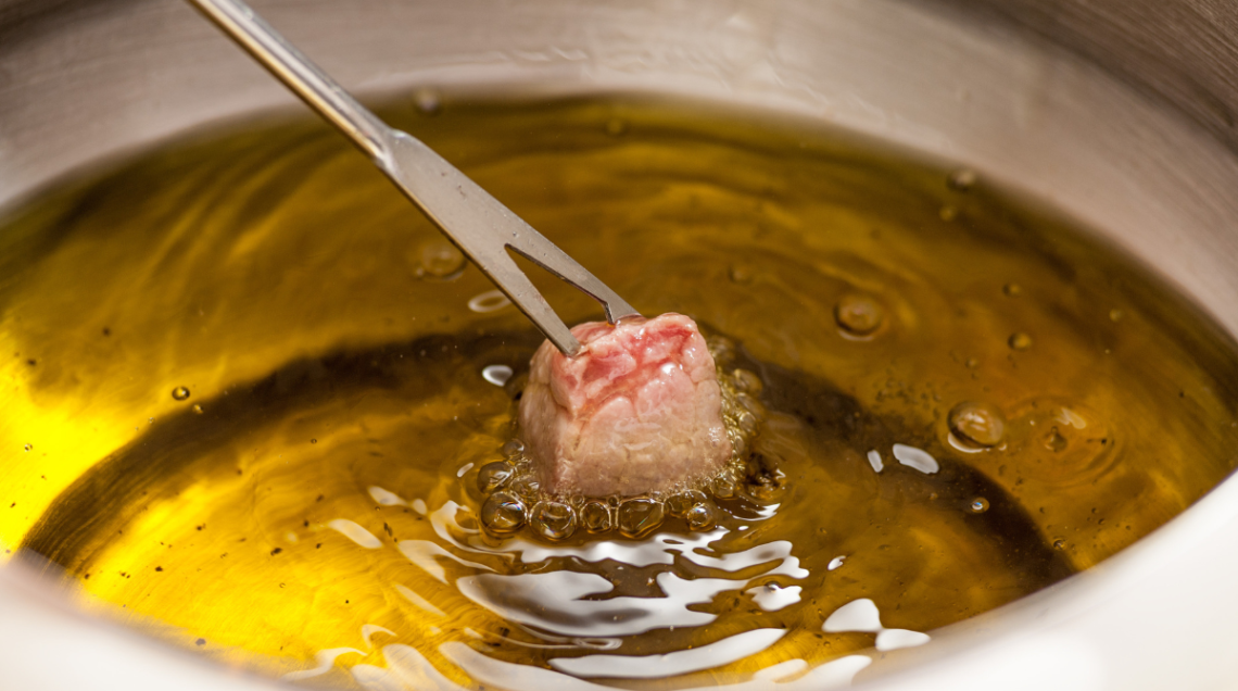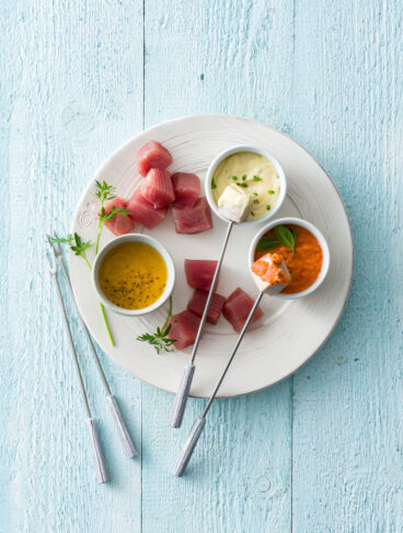 Esempio emblematico la Fondue Burguignonne. Un fornelletto al centro dove sobbolle un brodo di verdure o, e per più arditi, un olio vegetale bollente (occhio agli incidenti). Un piatto ricco di bocconcini di carne di ogni taglio e natura (filetto, pollo, salsiccia) e via libera alle salsine più fantasiose o più classiche, homemade o commerciali. Esteticamente suggestivo l’attrezzo per la borguignonne sembra effettivamente pensato per chi predilige lo star bene e le chiacchiere a tavola, al posto di cene ben più raffinate che hanno però il difetto di escludere irrimediabilmente uno dei commensali costretto a districarsi tra continue fughe in cucina. Ognuno ha la sua forchettina e ognuno fa da sé.