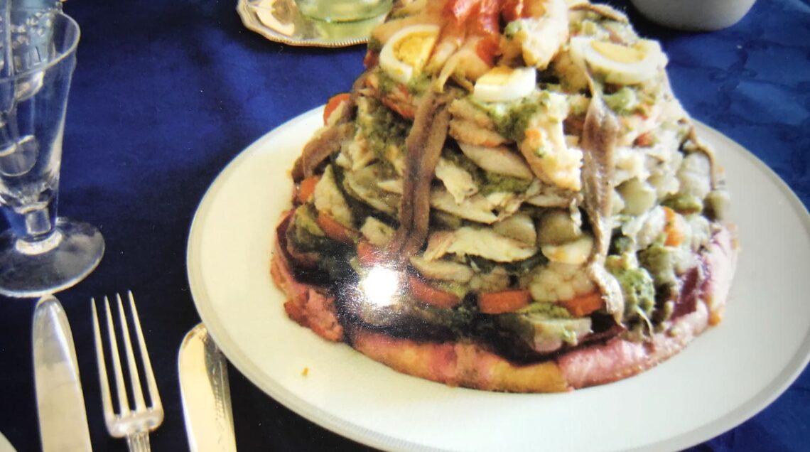 Le versioni sono tante e varie e ogni ricetta dice la sua. Nonna Mafalda usa i carciofi, i fagiolini, la scorzonera, la barbabietola e il cavolfiore. E ci aggiunge anche un po’ di carota, essenziale per il gusto e per l’armonia dei colori. Non vuol sentir parlare di gelatina e precisa che l’ordine in cui stratificarle è essenziale, iniziando dalla barbabietola sulla quale vanno a posarsi i pesci bianchi. In aggiunta alle verdure usa il branzino, il cappone, i gamberi e l’aragosta. Ogni verdura va ovviamente bollita a parte, così come ogni pesce, ragion per cui non è esattamente un fast food. E mai dimenticarsi la spennellata di salsa verde. Alla domanda “Ma quanto ci metti a farlo?” nonna Mafalda risponde ridendo “Una vita”.