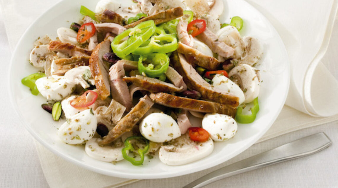Tagliate 4 fette di arrosto freddo a bastoncini e metteteli in un’insalatiera. Pulite 100 g di funghi champignon e tagliateli a fettine. Mondate e affettate 2 peperoncini rossi dolci freschi e un piccolo peperone verde. Riunite tutti gli ingredienti nell’insalatiera, aggiungete 80 g di ciliegine di mozzarella, spolverizzate con un cucchiaino di origano e condite con olio, succo di limone, sale e una macinata di pepe (per 4 persone).