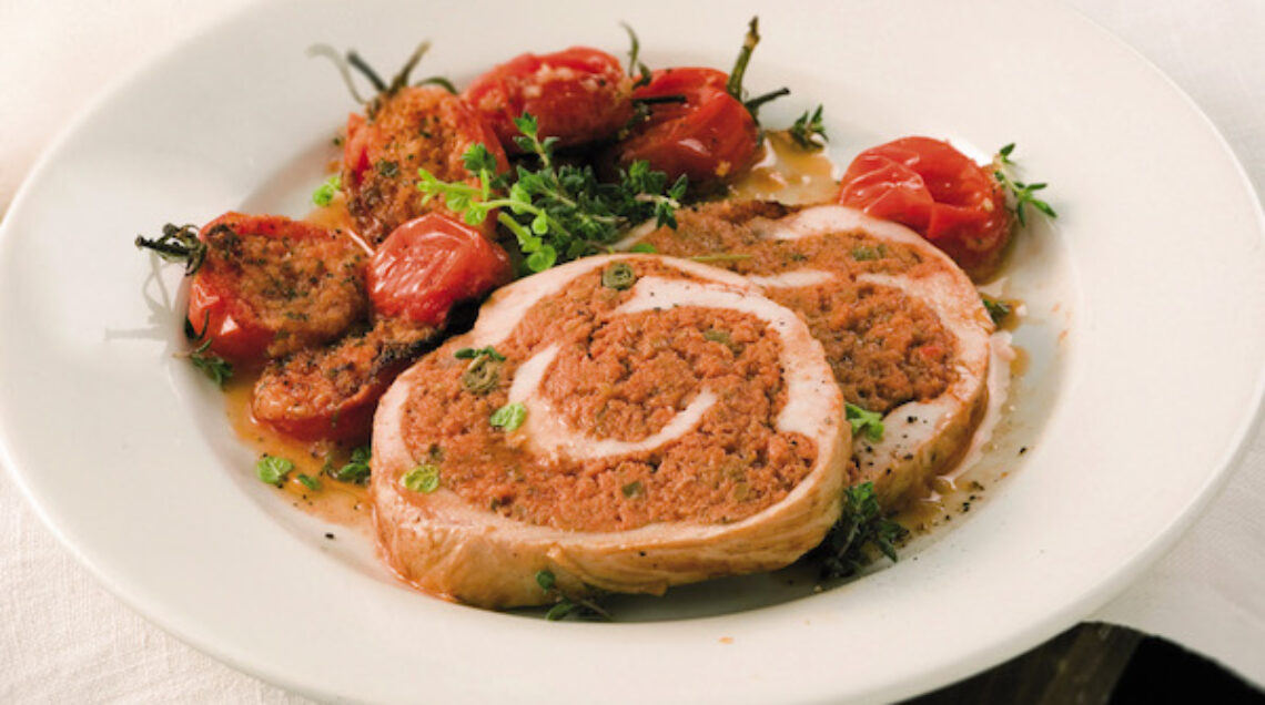 Frullate nel mixer 400 g di tonno sott’olio con 2 cucchiai di capperi dissalati, 100 g di concentrato di pomodoro, peperoncino e origano secco. Unite un tuorlo e 2 cucchiai di pangrattato. Battete una fetta di fesa di tacchino da circa 600 g tra due fogli di carta da forno, spalmatela con il ripieno, arrotolatela e legatela con qualche giro di spago. Rosolate il rotolo in una casseruola con un filo d’olio, unite una cipolla tritata, fate appassire, sfumate con vino bianco, salate, coprite e cuocete a fuoco dolce per circa 45 minuti. Lasciate raffreddare prima di affettare e servire, a piacere con origano fresco e pomodorini gratinati (per 6-8 persone).