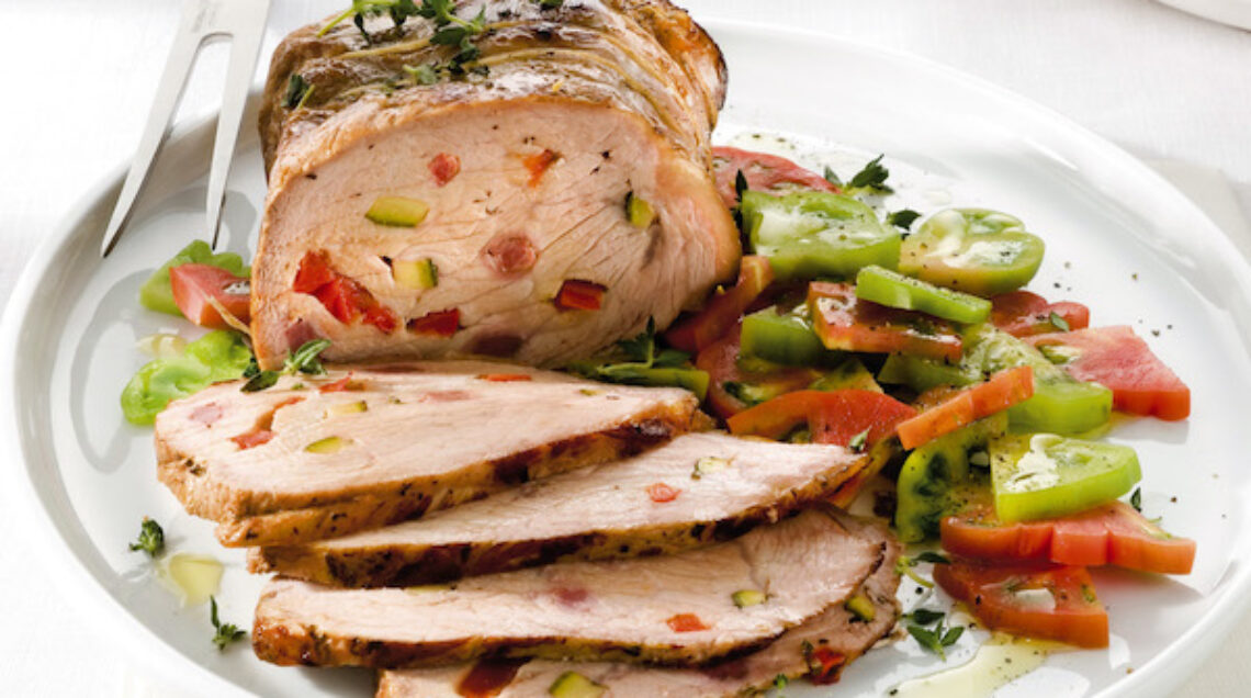Tagliate a bastoncini lunghi una zucchina, mezzo peperone rosso e una fetta spessa di prosciutto di Praga. Passateli in un trito di timo, rosmarino e una punta d’aglio. Con un coltellino affilato, forate in più punti un pezzo da un chilo di lombata o di sottofesa di vitello. Infilate nei forti gli ortaggi e il prosciutto. Legate la carne, rosolatela in una casseruola con un filo d’olio, con mezzo bicchiere di brodo leggero e cuocete coperto, a fuoco dolce, per circa un’ora. Sgocciolate la carne dal fondo e fatela raffreddare sotto a un peso (per 6-8 persone).