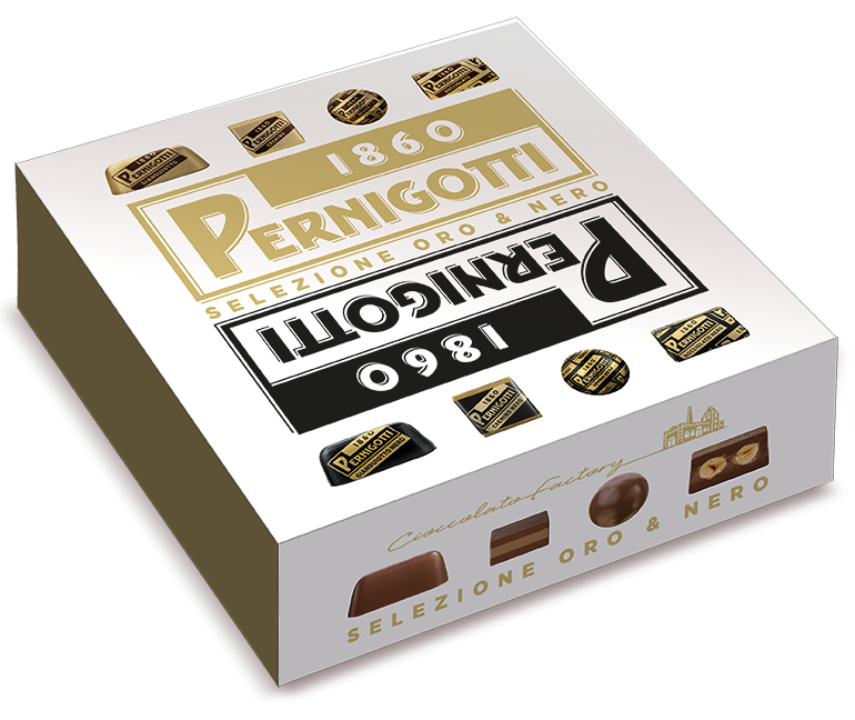 Altro valido assortimento di praline è quello proposto da Pernigotti: Gianduiotti, Gianduiotti Nero, Cremini, Cremini Nero, Gemme, Gemme Nero, Mini Nocciolato, Mini Nocciolato Nero, il tutto confezionato in una Selezione Oro e Nero (396gr) da 19,90 euro, oppure in una più piccola confezione dal look dorato, Oro, da 198gr che costa 10,50 euro. Le praline sono avvolte singolarmente.