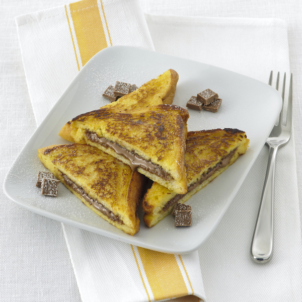 194363French toast al cioccolato. Tagliate a scagliette 100 g di cioccolato al latte (potete usare cioccolato già in sfoglie sottili). Sbattete un uovo con 2 dl di latte e un cucchiaio di zucchero semolato. Sovrapponete 2 fette di pancarrè o panbrioche mettendo in mezzo ¼ delle scagliette di cioccolato. Preparate allo stesso modo altri 3 sandwich. Passate i bordi dei sandwich in un velo di farina, poi immergeteli nella miscela di uova rigirandoli perché si imbevano uniformemente. Friggete i french toast in una padella con abbondante burro spumeggiante, su entrambi i lati, finché risultano ben dorati, girandoli delicatamente una volta con 2 palette. Trasferiteli su un tagliere, divideteli a metà, spolverizzateli di zucchero a velo e servite.