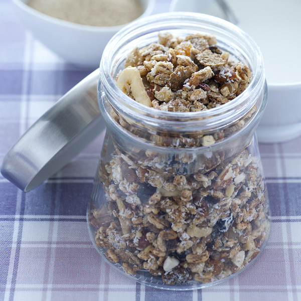 194364Muesli fatto in casa. Sminuzzate 50 g di albicocche disidratate, 50 g di fichi secchi e 50 g di prugne secche senza nocciolo. Raccoglieteli in una ciotola con 40 g di banane disidratate sminuzzate, 30 g di cocco secco un scaglie e 50 g di uvetta. Scaldate 50 ml d’acqua in un pentolino e scioglietevi 3 cucchiai di sciroppo d’acero o miele. Tritate grossolanamente nel mixer 50 g di gherigli di noci e 50 g di mandorle, mescolateli in un’altra ciotola con 200 g di fiocchi d’avena, 40 g di corn flakes integrali e 40 g di orzo o riso soffiati. Bagnate con lo sciroppo e mescolate (il composto deve risultare appiccicoso). Allargate il mix su una placca foderata con carta da forno e infornate per 5 minuti a 170°, mescolando a metà cottura. Sfornate e fate raffreddare, spezzettando il composto con le dita. Infine, mescolatelo con la frutta preparata. Il muesli si prepara in anticipo e si conserva per un paio di settimane, ben chiuso in un barattolo con il tappo a vite.