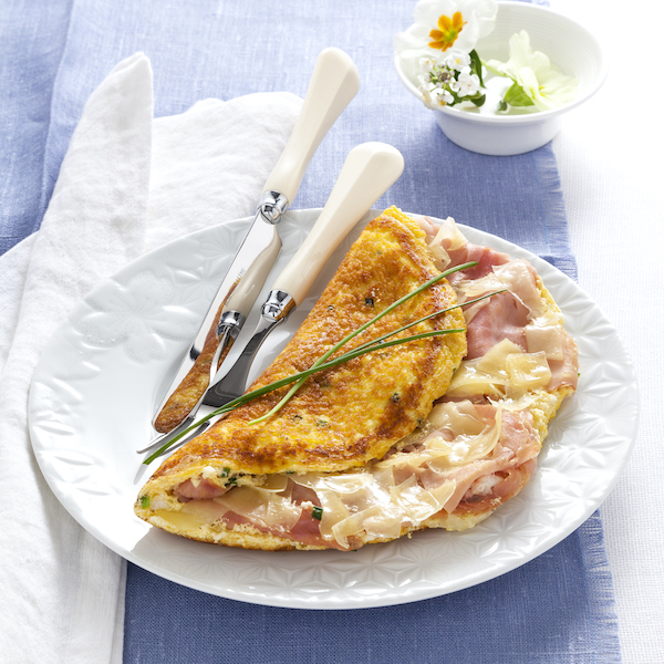 194365Omelette soufflé con formaggio e prosciutto. Tagliate 50 g di emmentaler o gruyère a fettine sottili (potete usare un pelapatate). Sgusciate 6 uova, separando i tuorli dagli albumi in due ciotole distinte. Sbattete leggermente i tuorli e aggiungete qualche stelo di erba cipollina tagliuzzata, un pizzico di sale e una macinata di pepe. Montate gli albumi e amalgamateli delicatamente al composto di tuorli, mescolando con una spatola. Sciogliete 40 g di burro in una larga padella e versatevi il composto di uova. Cuocete l’omelette su fiamma bassa per 3-4 minuti. Senza girarla, copritela con le lamelle di formaggio e 100 g di prosciutto cotto a fettine. Ripiegatela, fate scaldare ancora qualche istante, finché il formaggio è fuso, e servite (in alternativa, potete preparare anche 4 omelette individuali: tenete quelle pronte in caldo in forno a 80°, mentre cuocete le altre). Per 4 persone.