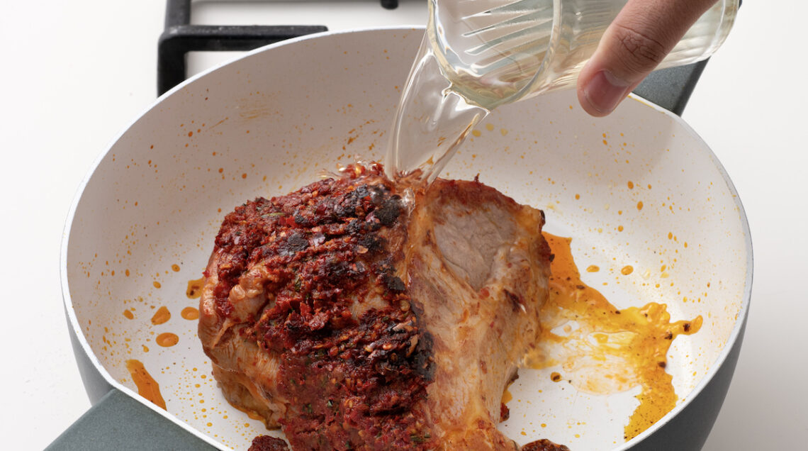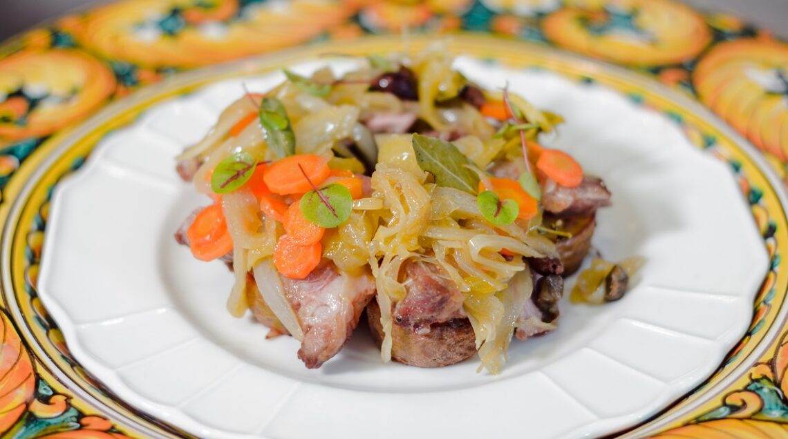 Fettine da servire a temperatura ambiente con un intingolo agrodolce di sedano, carote, cipolle, capperi, menta, aceto e miele: è la coppa alla stimpirata nella videoricetta del nostro chef Stefano Grandi.