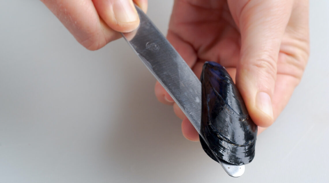 Per alcune ricette, come quando si preparano le cozze gratinate o ripiene, occorre aprire le conchiglie a crudo. Per farlo, fate scorrere e scivolare leggermente la valva superiore su quella inferiore, spingendola con il pollice. Quindi, infilate la lama di un coltellino tra le due valve e fatela ruotare in modo da forzare e aprire i gusci (foto in basso).