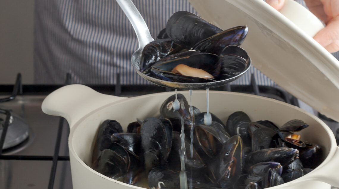 In tutti i casi in cui le cozze si cucinino da chiuse, la cottura - che corrisponde anche all’apertura - è facile e veloce. Le cozze si cuociono in un tegame ampio, che le contenga comodamente, “a secco” oppure con un filo d’olio, un po’ di vino bianco, aromi vari (rametti di prezzemolo, spicchi d’aglio) o un soffritto, per esempio di scalogno. Messo il coperchio, il tegame si porta su fiamma vivace: i molluschi si schiuderanno in pochi minuti, durante i quali smuoverli spesso sia perché prendano il calore in modo uniforme, sia perché si mescolino con gli eventuali condimenti. Così cucinate, le cozze sono già pronte da servire. Se invece si vogliono unire ad altre preparazioni, come sughi e intingoli, occorre sgocciolarle con una schiumarola (foto in basso), senza dimenticare di recuperare e filtrare il loro saporito fondo di cottura, da unire agli intingoli.