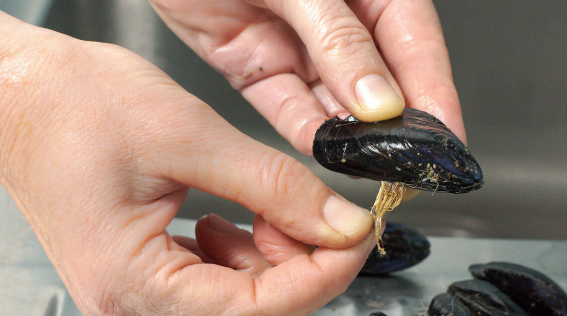 L’operazione successiva consiste nello strappare il bisso, le barbe che escono dalle valve e che permettono al mollusco di ancorarsi a scogli e pali. Basta afferrare il ciuffo di filamenti e tirarlo verso il vertice delle conchiglie (foto in basso).