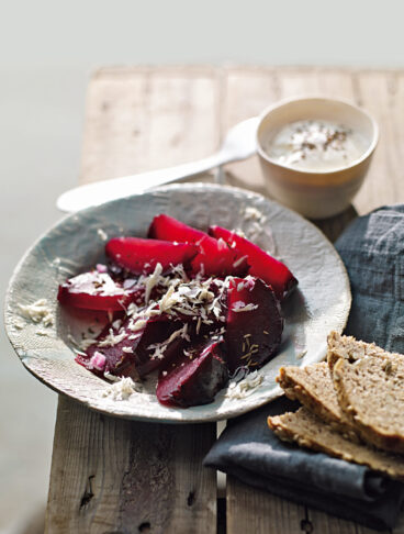 Passate al passaverdure 100 g di ceci lessati e frullateli con 250 g di barbabietole cotte, sbucciate e a pezzetti, un filo d’olio, un cucchiaio di succo di limone, 1-2 cucchiaini di crema di rafano, sale e poca acqua. Potete guarnire questo insolito hummus con una cucchiaiata di panna acida o di yogurt e con chips di barbabietole.