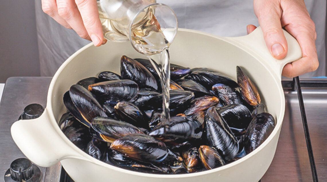 I bianchi secchi sono un classico nei risotti e in molti sughi per la pasta, in arrosti e scaloppine, con pesce e crostacei, nel fondo in cui si fanno aprire i molluschi (in basso) e nelle ricette a base di verdure.