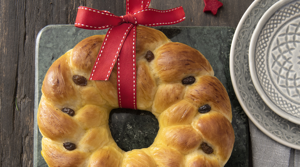 Una ghirlanda che viene voglia di mordere? Preparate la ciambella lievitata al cardamomo e uvetta (foto in alto), legatela con un bel nastro rosso e il gioco è fatto!