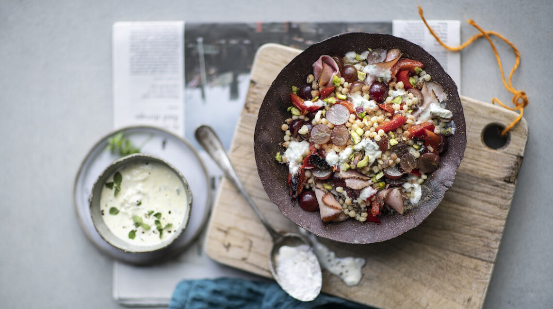In versione estiva, la fregola si può condire come una insalata di riso o un cous cous freddo aggiungendo verdurine crude, pomodori freschi o secchi, olive, dadini di formaggio come pecorino o feta e così via. Se però volete una ricetta wow, provate la nostra insalata con prosciutto arrosto, uva e peperoni (foto in alto): rifrescata dalla stracciatella, con il tocco croccante dei pistacchi, rivela tutta la versatilità di un ingrediente tradizionale che sa anche diventare creativo e sorprendente.