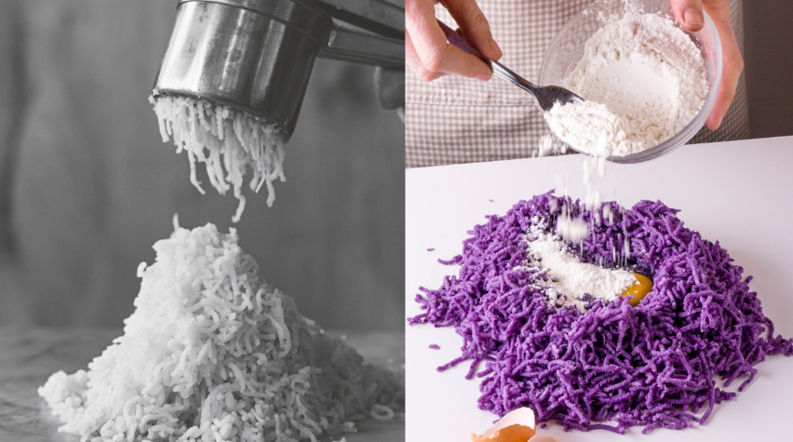 Gli gnocchi si acquistano anche già pronti in panetteria o confezionati nella grande distribuzione, ma la soddisfazione dell’home made è tutta un’altra cosa; con patate bianche (foto sopra a sinistra) o viola (foto sopra a destra) gli gnocchi, di cui vi spieghiamo qui la ricetta base, hanno un gusto delicato ma sapido, che si perfeziona con la scelta del tipo di patate e qualche trucco, indispensabile nel procedimento e nella cottura, come vi raccontiamo qui. Se cercate una scorciatoia potete sfruttare anche i fiocchi di patate pronti, quelli che si usano per il purè, come nella ricetta degli gnocchi farciti di funghi, un piatto raffinato profumato con lamelle di tartufo. La cottura avviene in primis in acqua bollente salata, sufficiente per condire gli gnocchi a piacere e servirli. Semplici e veloci si sposano con il sugo di finferli, poi si può procedere a una seconda cottura con il condimento in padella, gnocchi con ortaggi, zafferano e culatello e gnocchi cacio e pepe, al forno, come abbiamo fatto con gli gnocchi al gratin, cosparsi di fontina e parmigiano, o al cartoccio. Quelli di patate si possono anche farcire con formaggio e condire con radicchio e acciughe o accompagnare, secondo un’antica tradizione lombarda, con sugo di gallo per gli gnocchi “alla gratirouela”. Ideali anche con la vellutata di asparagi, un primo piatto primaverile profumato allo zafferano, in salsa di cipolle, con burro e acciughe, e con ragù di carne, proposti in forma allungata e di grosse dimensioni e serviti al cucchiaio. Se vi piace mescolarli con formaggio cremoso, gli gnocchi al gorgonzola sono una proposta rustico-chic, come anche gli gnocchi che si propongono in tandem con taleggio e noci o con stracchino e porcini. Più ricercati gli gnocchi al montasio, la cui sapidità è esaltata dai chicchi di uva americana e gli gnocchi con prosciutto di Sauris, due eccellenze del nostro patrimonio gastronomico. Con sfumature marinare, più delicati ma altrettanto sfiziosi, si presentano con pesto e dadolata di scampi e con baccalà, olive e pinoli.