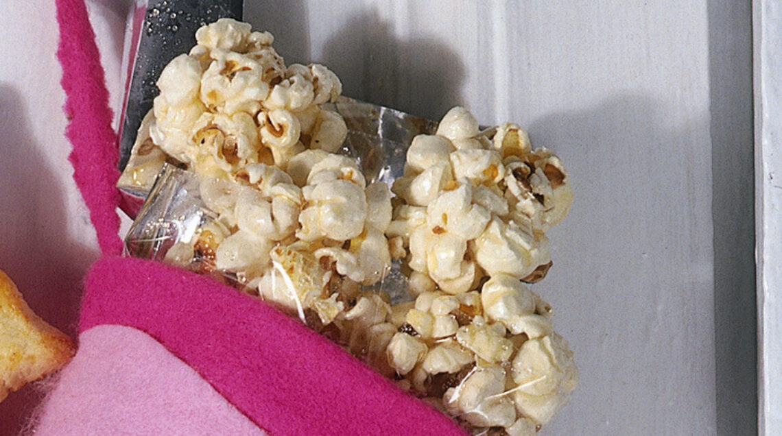 Preparate i pop corn cuocendo in più riprese (un cucchiaio per volta) 150 g di chicchi di mais in una piccola casseruola, con il coperchio, su un filo di olio di semi di arachidi. Riuniteli via via in una ciotola. Nel frattempo, sciogliete in un pentolino, a fuoco basso, 175 g di zucchero con 175 g di miele, mescolando finché si forma un caramello ambrato. Salatelo leggermente. Mescolate il caramello poco a poco sui popcorn ancora caldi, lasciateli intiepidire, quindi formate tante palline (circa 30) con le mani unte d’olio. Fatele raffreddare su un vassoio rivestito di carta da forno prima di incartarle.