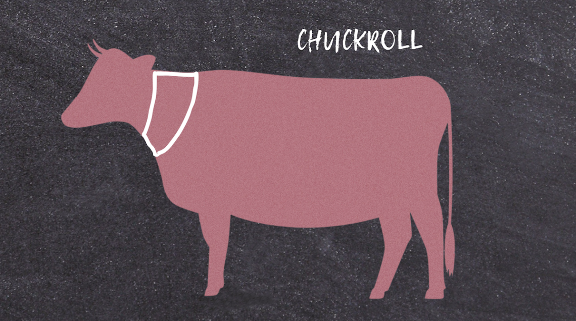 Con i suoi 5-6 chili di peso, il chuck roll è uno dei tagli più possenti dell’anteriore, caratterizzato da una doppia identità. La parte che si trova rivolta verso la lombata, cioè verso il centro della schiena del bovino, è la più simile -per struttura e compattezza - alle vicine costate, ovvero a quella polpa che costituisce il prezioso cube roll. La sua seconda sezione, quella rivolta verso il collo dell’animale, è meno uniforme, più mista, coperta di grasso esterno e intersecata da strati di tessuto connettivo piuttosto tenace (nella foto in basso, è la parte superiore: tenete presente che, nell’animale, il taglio è disposto in verticale, non in orizzontale come presentato nell’immagine).