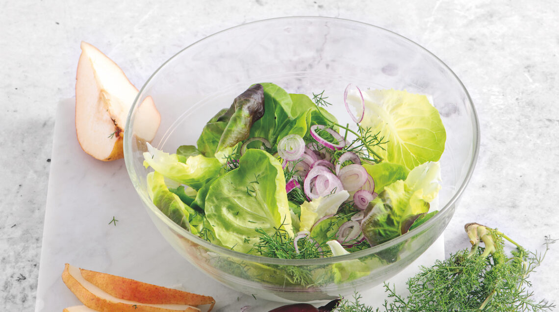 Per l’estate, l’idea perfetta è mescolare ortaggi di stagione e frutta: abbinamenti che si ritrovano nell’insalata aromatica con avocado e prugne (foto in alto).