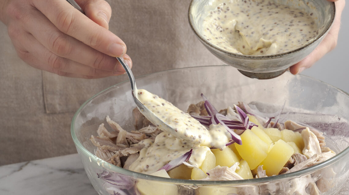 Soprattutto la parte del petto (meno ali, cosce e sovracosce) una volta fredda resta un po’ asciutta e chiama una salsa umida e avvolgente. Può essere una citronette o una vinaigrette ben emulsionate o, classicamente, una maionese, anche arricchita: con una buona dose di senape, un trito di erbe e, se piace, anche una punta di aglio (foto in alto). Naturalmente sono indicate tutte le salse a base mayo, da quella rosa alla tartara alla tonnata. Per renderle più leggere, potete usare una parte di yogurt. Le ricette possono essere le più diverse e fantasiose. Fra gli ingredienti insoliti che ben si abbinano a questa ricetta, l’aceto balsamico (anche in glassa), il wasabi giapponese, il cren, il Tabasco o la salsa Worcester. La salsa si può stemperare con un filo d’olio e una spruzzata di succo di agrumi (limone, lime o arancia), direttamente sul fondo della terrina che andrà a raccogliere gli sfilacci di pollo e, via via, tutti gli altri ingredienti della ricetta.