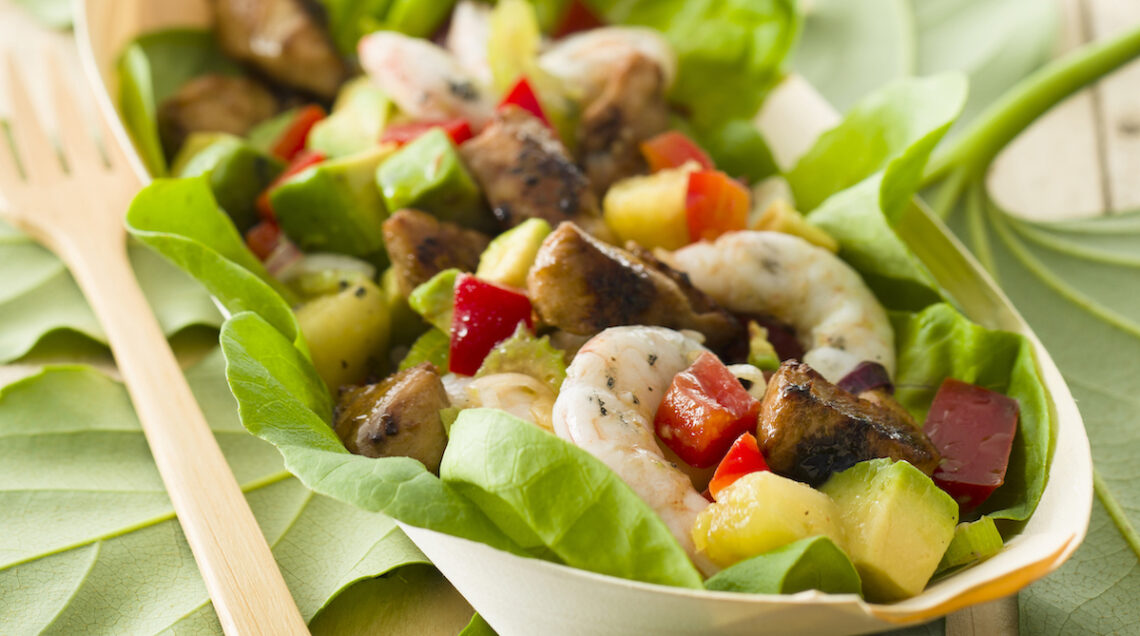 Dadini di formaggio, pancetta rosolata, uova sode a spicchi: non c’è limite alla fantasia quando si tratta di comporre un’insalata di pollo. Per una versione esotica, abbinate gamberi, ananas e avocado (foto in alto) Per 6 persone, marinate 500 g di petto di pollo a dadini in una ciotola con una spruzzata di salsa di soia, olio, sale e paprica, poi sgocciolatelo e saltatelo in padella. Lessate e sgusciate 350 g di code di gambero, scolatele e conditele con il succo di mezzo lime, olio, sale e pepe. Riducete a dadini la polpa di 1-2 avocado, spruzzandoli con succo di lime, 4 fette di ananas, un peperone rosso e 1-2 coste di sedano. Riunite in una ciotola pollo, gamberi, frutta e ortaggi. Aggiungete una manciata di anacardi, condite con olio e succo di lime, regolate di sale e pepate. Servite su un letto di lattuga.